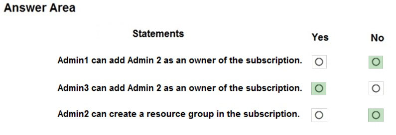 The tenant is associated to an Azure subscription. Access control for the subscription is configured as shown in the Access control exhibit. (Click the Access