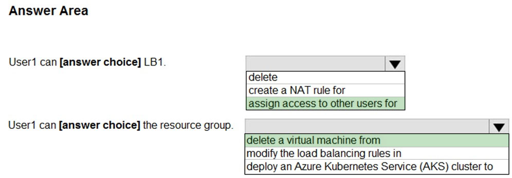 - A. Remove User1 from the Security Reader role for Subscription1. Assign User1 the Contributor role for RG1.