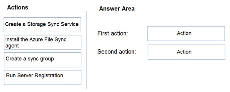 Which two actions should you perform in the Azure subscription? To answer, drag the appropriate actions to the correct targets. Each action may be used once, more than once, or not at all. You may need to drag the split bar between panes or scroll to view content.