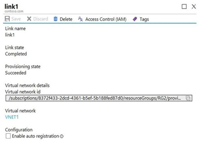 For controso.com, you create a virtual network link named link1 as shown in the exhibit. (Click the Exhibit tab.)