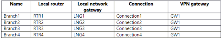 Your company has four branch offices and an Azure subscription. The subscription contains an Azure VPN gateway named GW1.