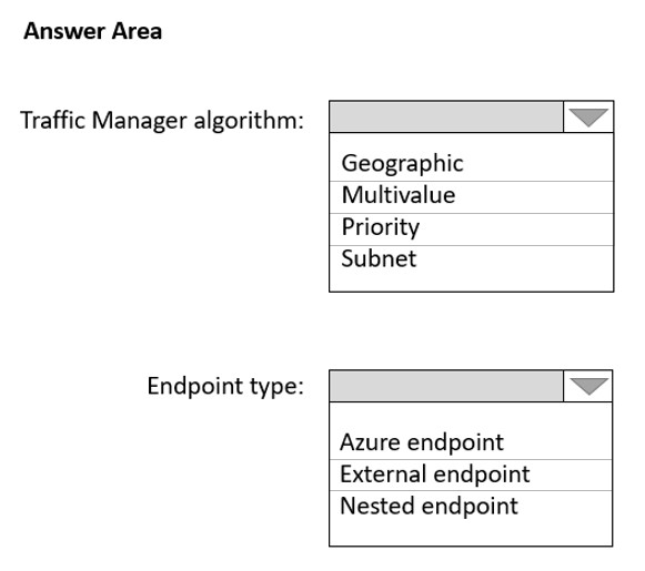 https://docs.microsoft.com/en-us/azure/traffic-manager/traffic-manager-routing-methods https://docs.microsoft.com/en-us/azure/traffic-manager/traffic-manager-endpoint-types