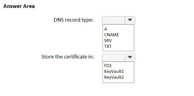 Which type of DNS record should you create, and where should you store the certificate? To answer, select the appropriate options in the answer area.